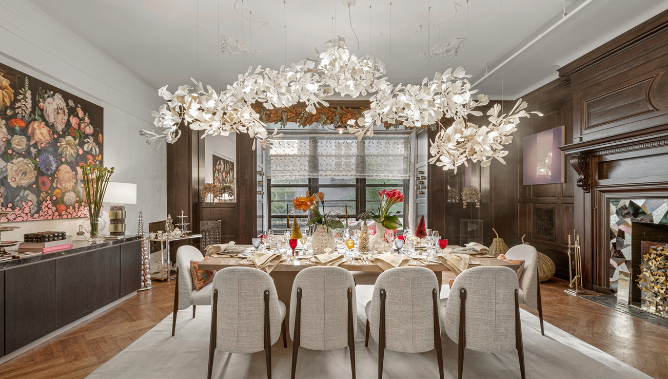 Each chandelier is composed of hundreds of handcrafted porcelain elements that create a mesmerizing interplay of light and shadow.